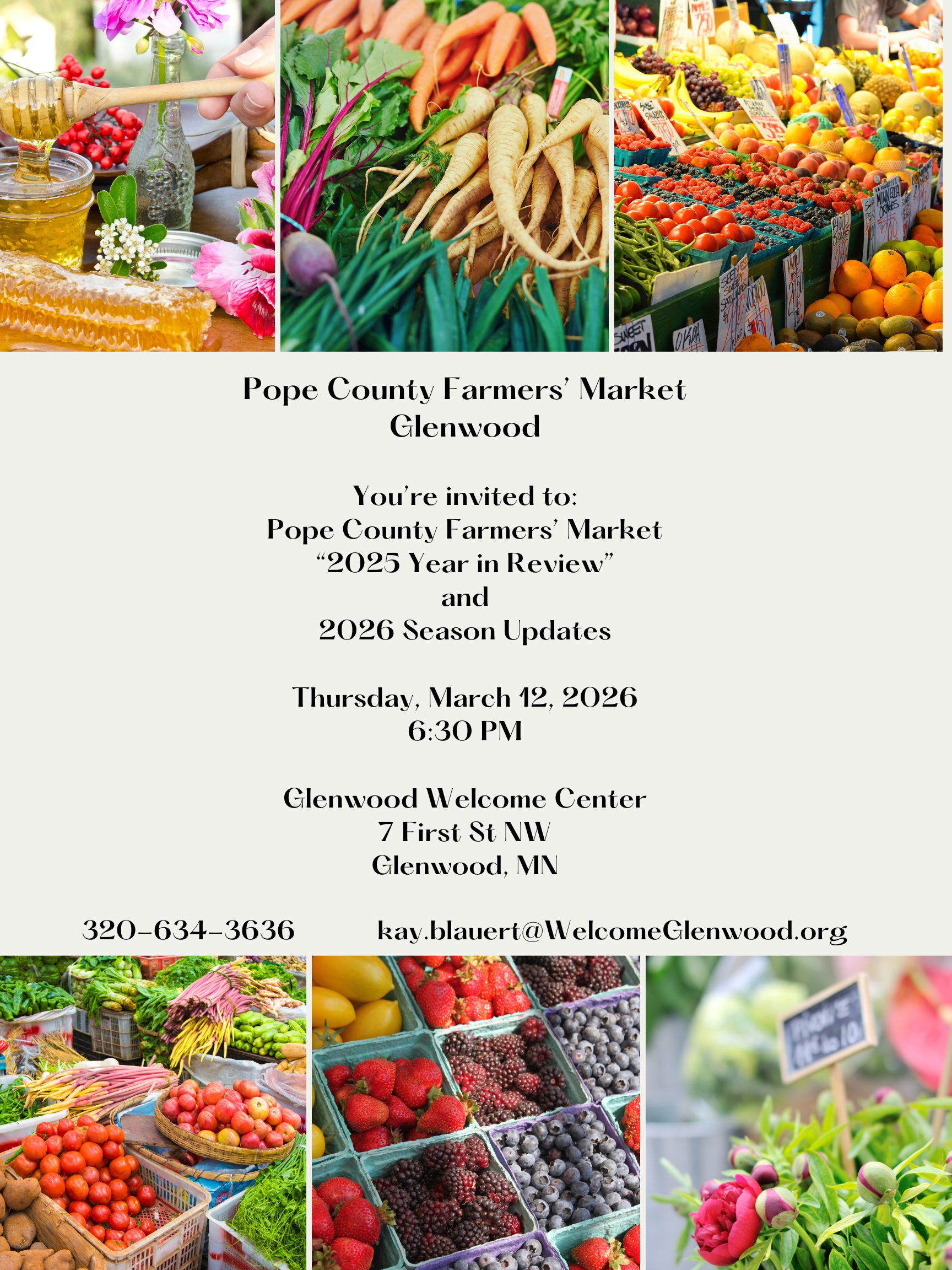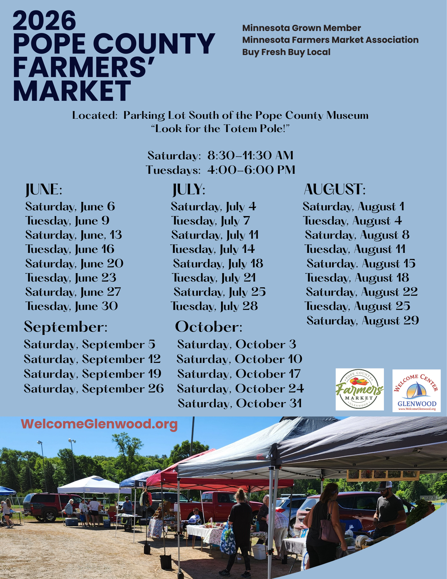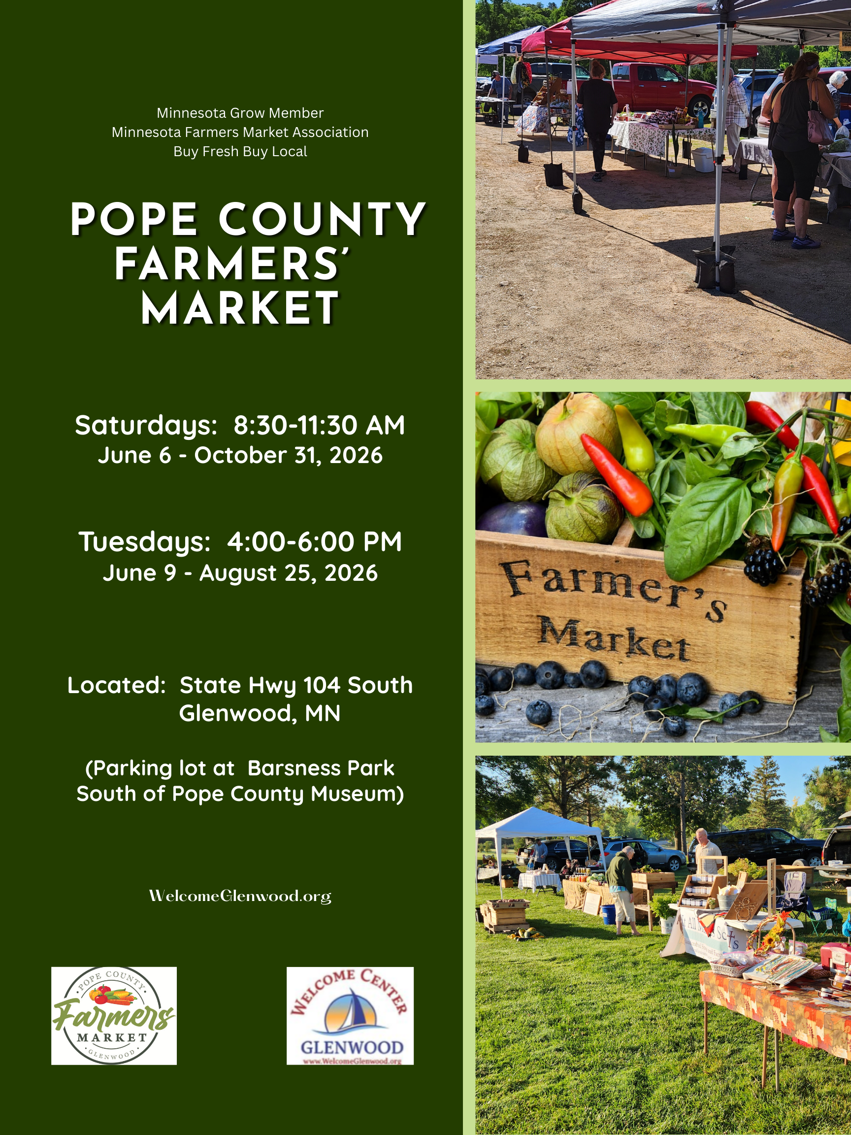 To learn more about the details of the Pope County Farmers' Market, Glenwood please see below or you can call (320) 634-3636 OR 320-226-0810 for more information.